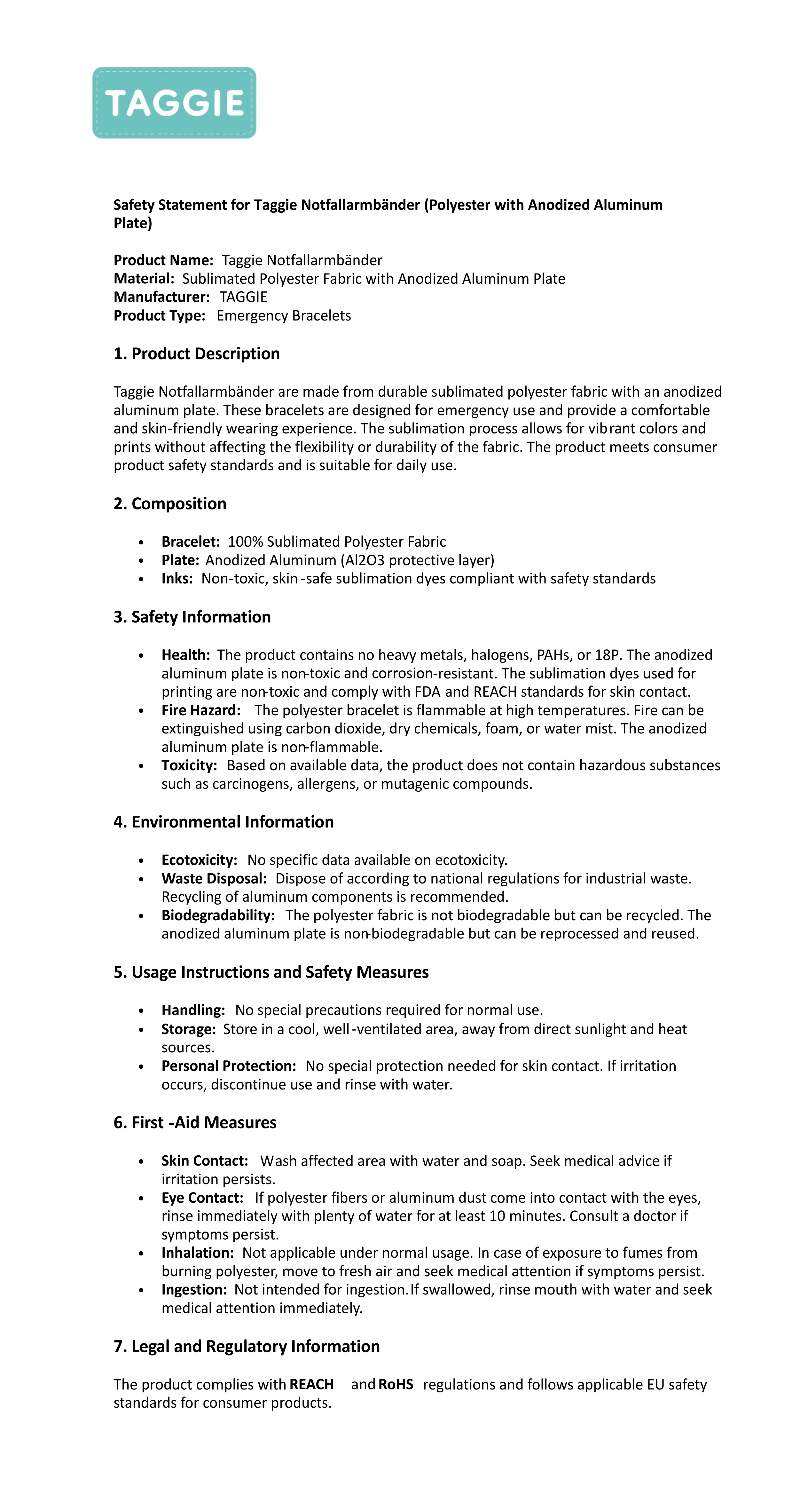 Thank you for purchasing Taggie products. Our bracelets are made from strong and flexible materials that are comfortable and non-irritating.